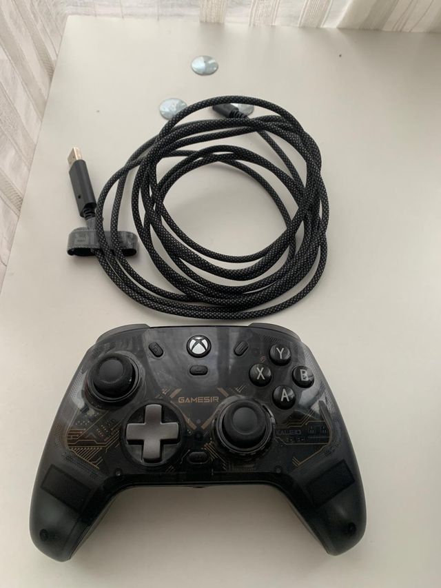 Detalles del productoMando de control GameSir con diseño transparente y detalles en dorado, compatible con Xbox y PC. Incluye cable de conexión.