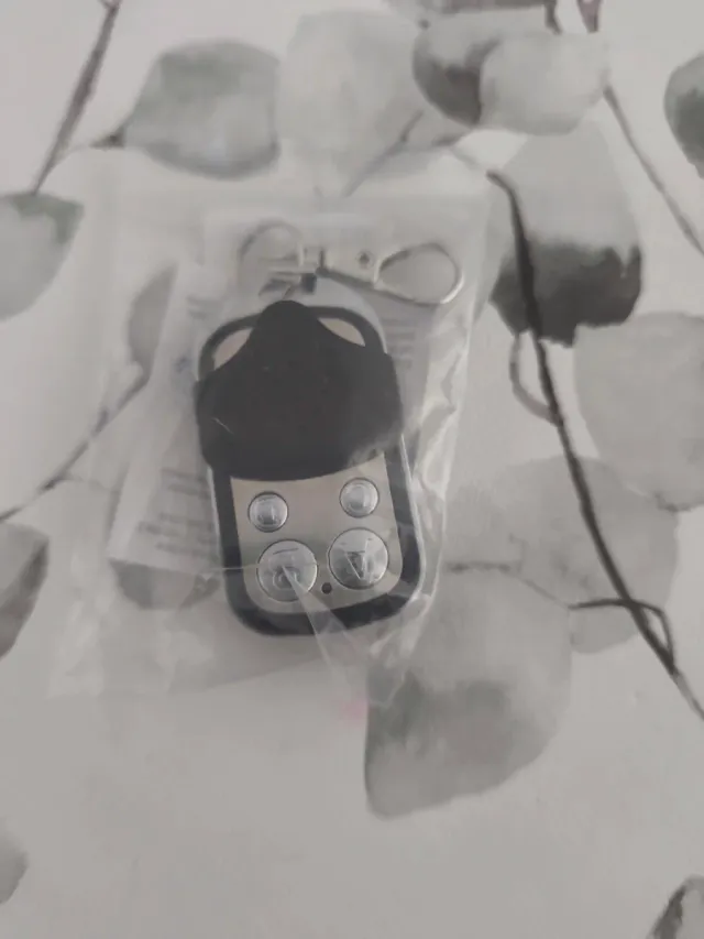 Mando a distancia para garaje con cuatro botones. - Diseño compacto y moderno. - Incluye llavero para fácil transporte.
