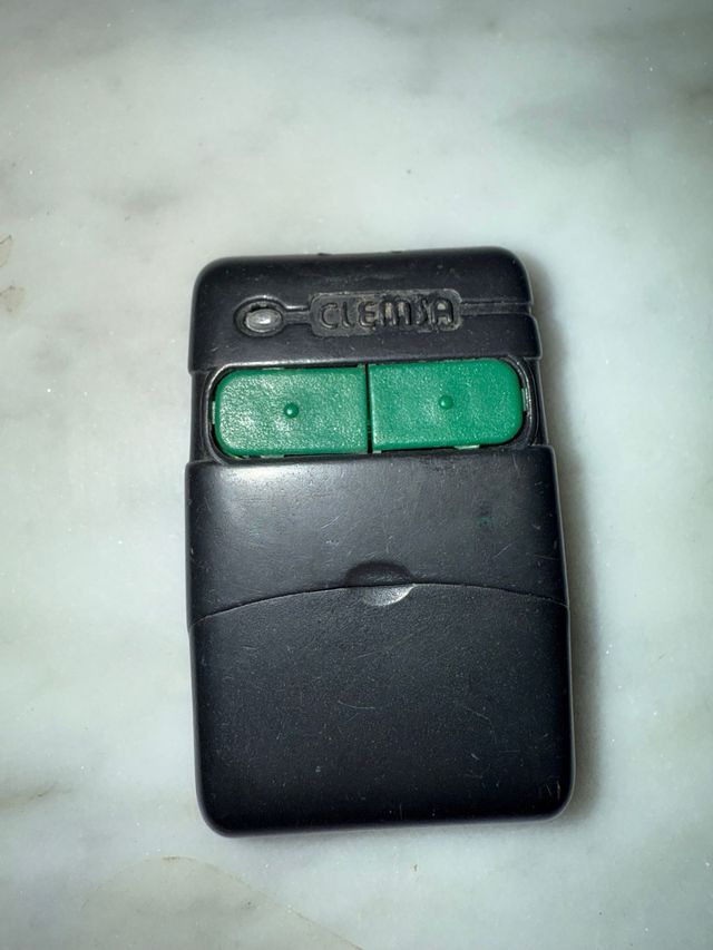 Mando a distancia para garaje de la marca Clemsa. Dispone de dos botones. - Color negro. - Dos botones verdes.