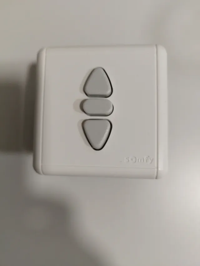 Detalles del productoMando a distancia para persianas de la marca Somfy. Diseño blanco con botones de control.