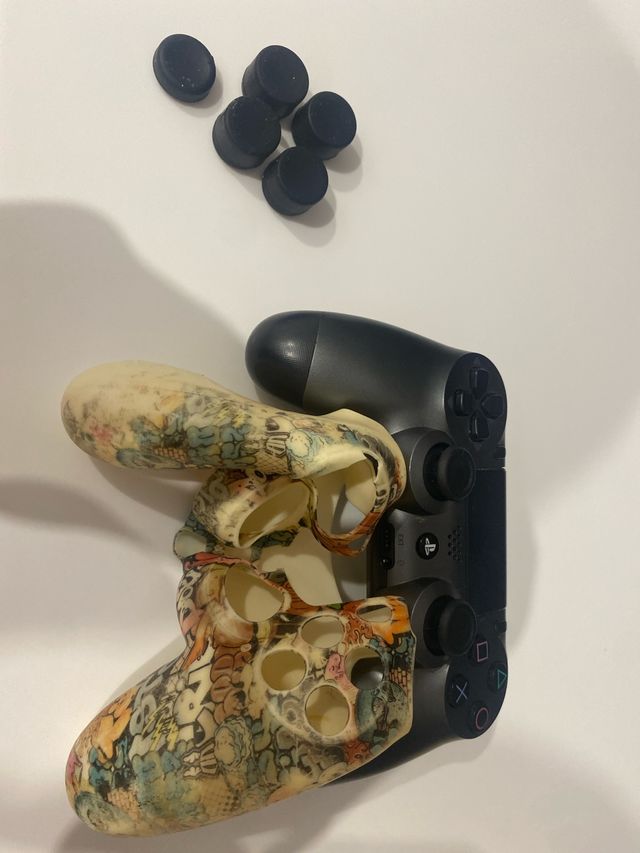 Mando de PlayStation 4 con una funda decorada con un diseño llamativo. - Funda con estampado de grafitis y calaveras. - Incluye 5 tapas negras para los joysticks.