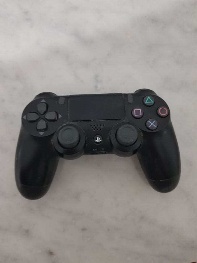 Mando de PlayStation 4 en color negro. Tiene bastante uso. Funciona bien excepto el cuadrado y el R2 fallan un poco.