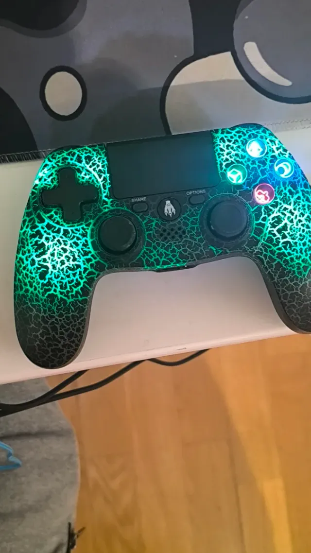 Mando de Play 4 con un diseño único y llamativo. - Diseño agrietado con iluminación LED verde. - Botones frontales iluminados en varios colores.