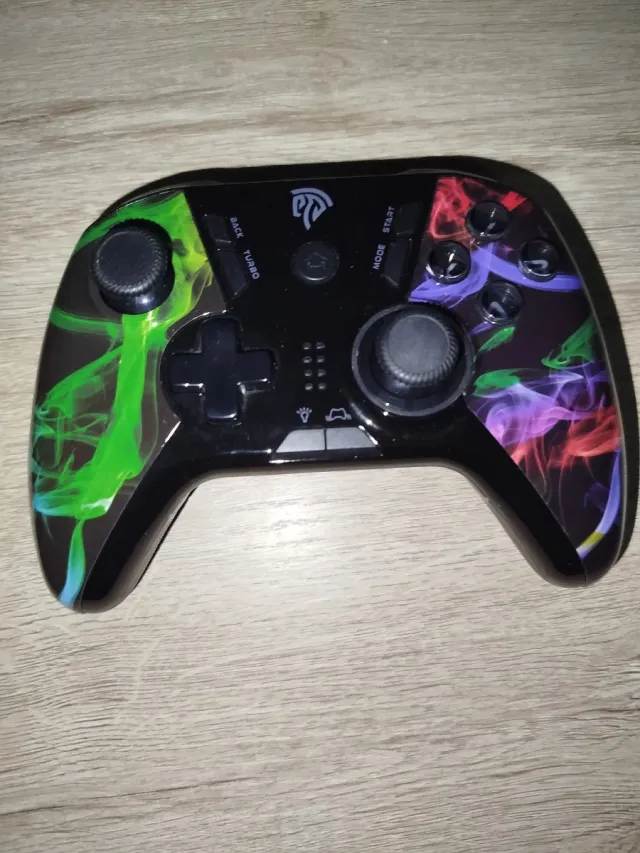 Mando de consola con un diseño único y llamativo. - Diseño con efecto humo en colores vibrantes. - Botones y joysticks negros. -Con la caja y cargador incluidos