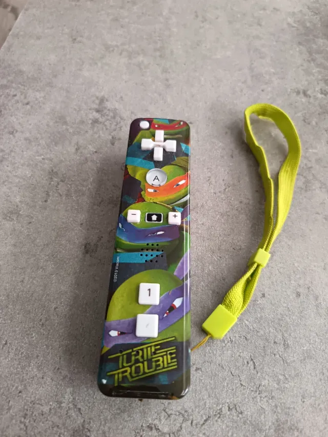 Mando de Wii personalizado con diseño de las Tortugas Ninja. - Diseño temático de Tortugas Ninja. - Incluye correa de seguridad. - Botones de control de Wii. - funcionando