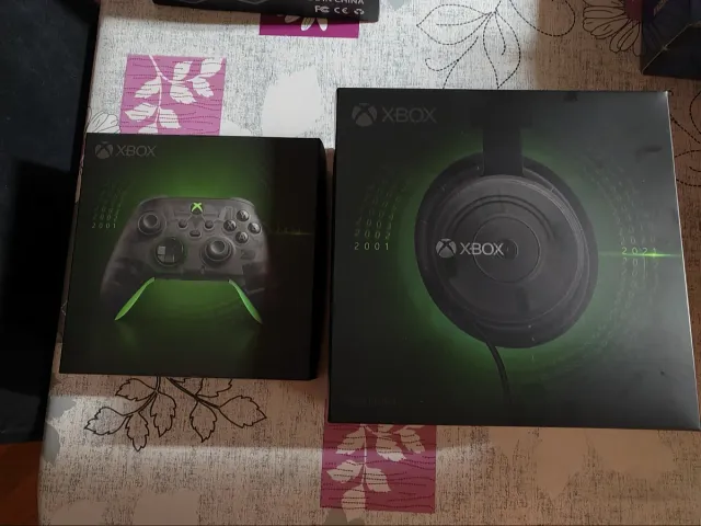 Pack conmemorativo del 20 aniversario de Xbox que incluye un mando y unos auriculares.