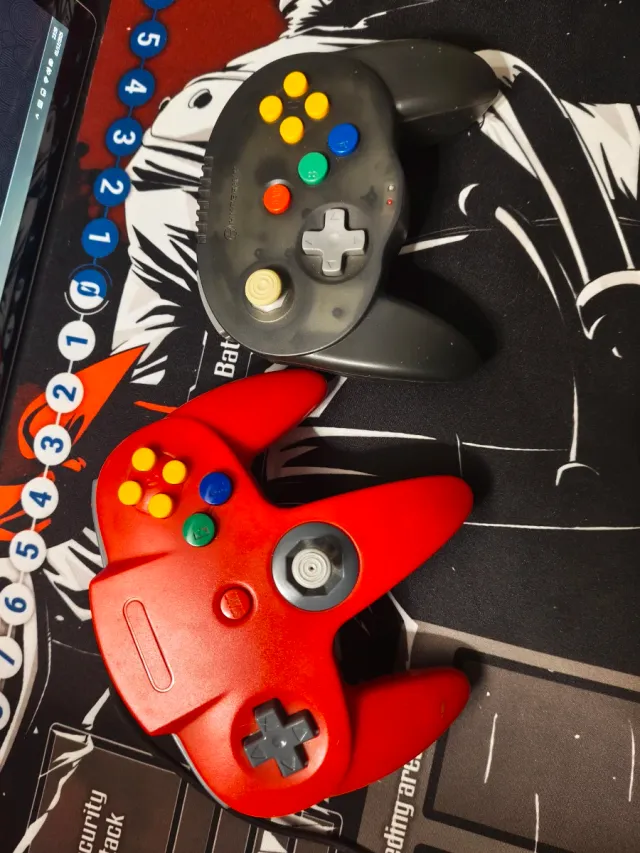 Detalles del productoDos mandos de Nintendo 64 compatibles con PC. Uno es de color rojo y el otro es negro semitranslúcido.