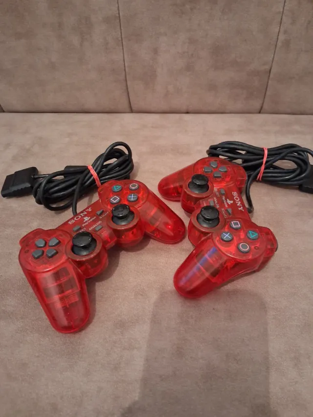 Detalles del productoPack de dos mandos para PlayStation 2 en llamativo color rojo transparente.