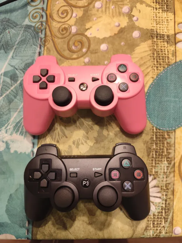 Dos mandos para PlayStation 3 nuevos, uno en color rosa y otro en negro. Ideales para jugar. - Mando rosa. - Mando negro.