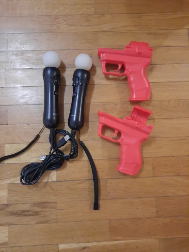 Lote de mandos de PlayStation 3 y accesorios tipo pistola. - Dos mandos de movimiento PS Move. - Dos accesorios de pistola para mandos PS Move.
