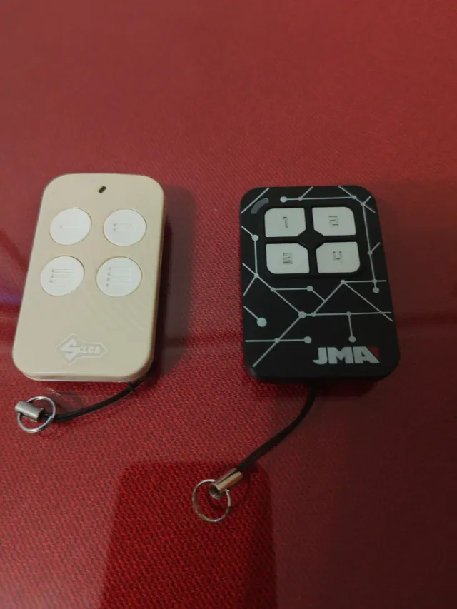Detalles del productoDos mandos para puertas de garaje, uno de la marca JMA y otro de la marca Clea. Ambos vienen con su cordón y aro para llavero.