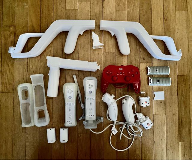Detalles del producto2 Mandos wii originales con sus fundas, 2 nunchacs, 2 rifles y una pistola . Los mandos muy usados pero en buen estado, el resto casi sin uso, como nuevo. El mando rojo ya se ha vendido