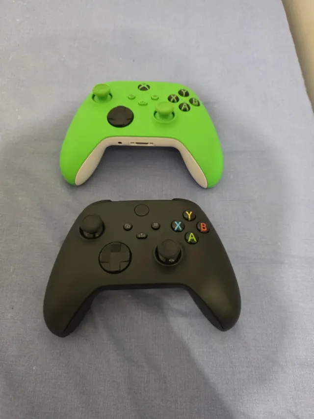 Dos mandos para Xbox. - Mando en color verde. - Mando en color negro.