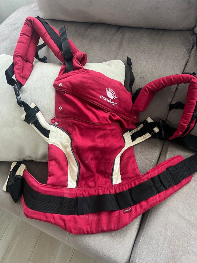 Detalles del productoPreciosa mochila portabebés Manduca de color rojo y detalles beige. Está en muy buen estado y lista para usar.