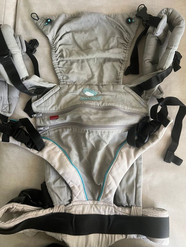 Detalles del productoPreciosa mochila portabebés Manduca XT en color gris y turquesa. Está en muy buen estado y lista para usar.