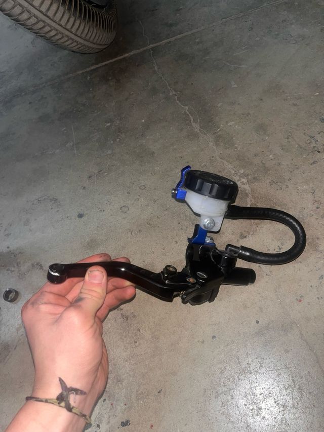 Maneta de freno delantero para motocicleta. Incluye depósito de líquido de freno. Valido para freno de disco. Muy Buen Estado.