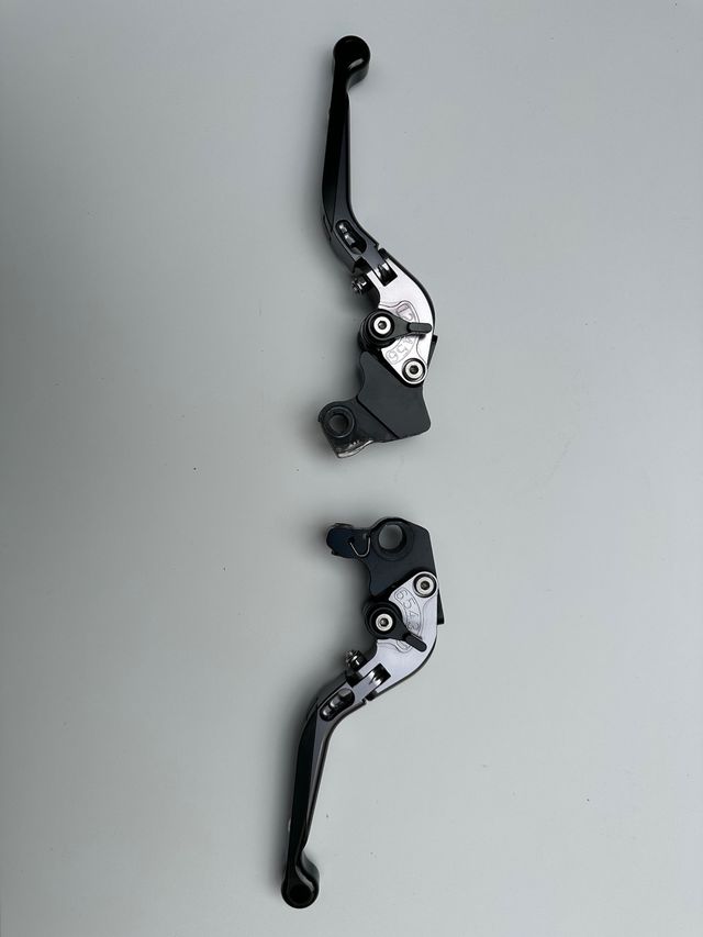 Manetas abatibles y ajustables de aluminio para Hypermotard. Diseño moderno y funcional. - Material: Aluminio. - Color: Negro y plateado.