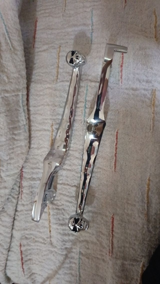 Par de manetas de moto con un diseño único de calavera. - Acabado cromado brillante. - Diseño de calavera en el extremo.