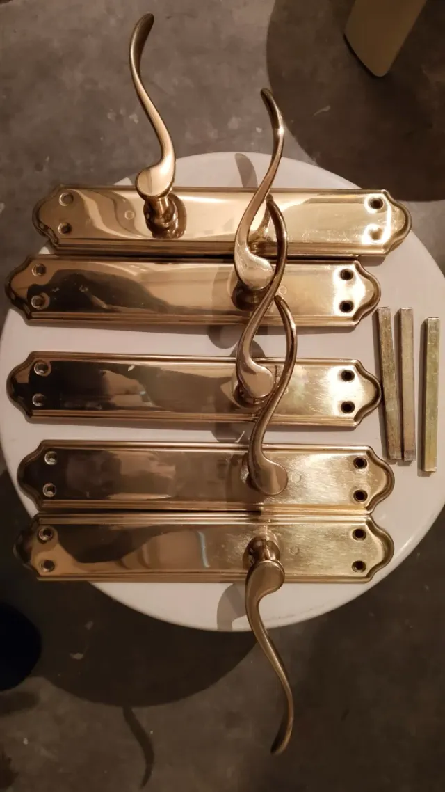 Conjunto de manetas de puerta de latón pulido. -5 manetas por 10 € todo - Diseño elegante y clásico. - Material: Latón. - Acabado brillante.