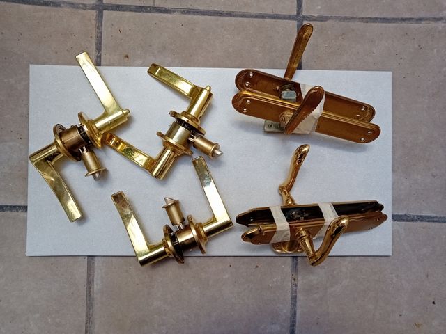 Detalles del productoManetas de puerta, de latón bañadas en dorado. 4 modelos diferentes. Los que se ven en las fotos. Se pueden vender todas juntas o por separado. 30€ todas juntas. 4€ la pareja. Con todos sus resbalones y cerraduras, más 4 tiradores sin abrir. Todo junto 30€