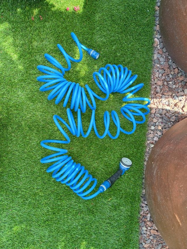 Detalles del productoManguera de riego en espiral, color azul. Ideal para regar tu jardín.