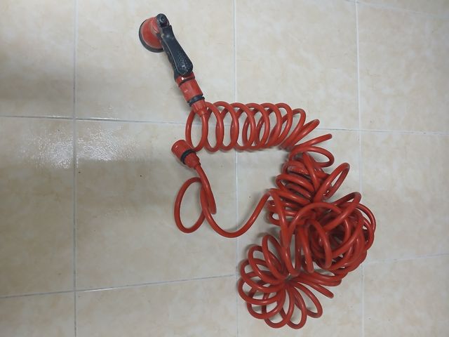 Manguera extensible de 10 metros . Con aplique para el grifo y regulador de volumen de agua. En buen estado. Práctico y fácil de utilizar y guardar.