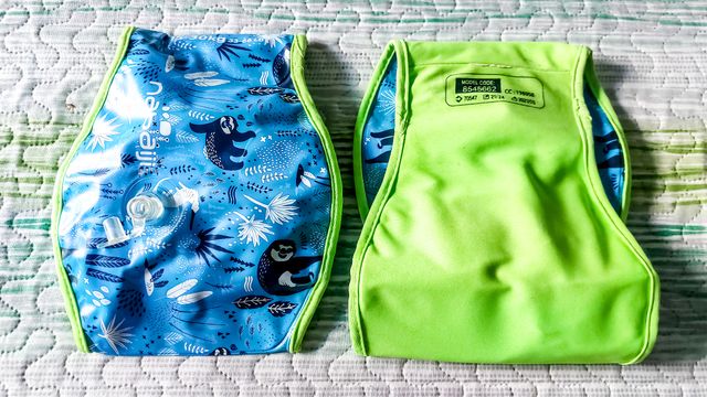 Detalles del productoManguitos de natación para niños de la marca Nabaiji, con un divertido estampado de perezosos y hojas en tonos azules.