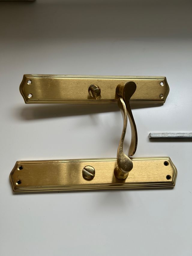 Detalles del productoJuego de manillas para puerta en latón con acabado cepillado. Incluye un mecanismo de cierre con seguro.
