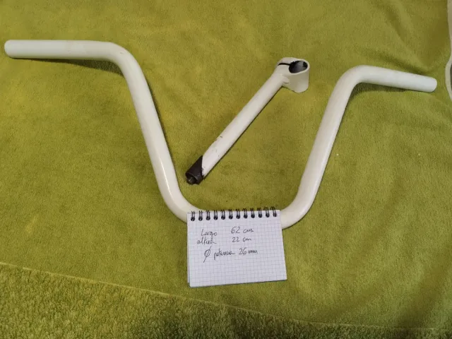 Manillar de bicicleta de estilo clásico en color blanco. Ideal para bicicletas vintage o de paseo. - Ancho total: 62 cm - Altura: 22 cm - Diámetro potencia: 26 mm