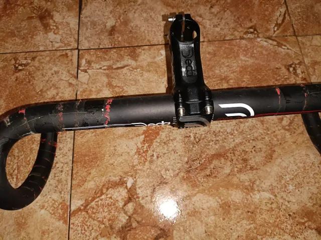 Manillar de carreras de color negro, con potencia. - Manillar de aluminio. - Potencia de aluminio. - Cinta de manillar negra con detalles rojos.