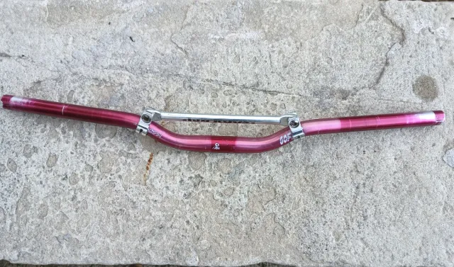 Detalles del productoManillar de doble altura en color rojo. Presenta un diseño curvo y un refuerzo central plateado.