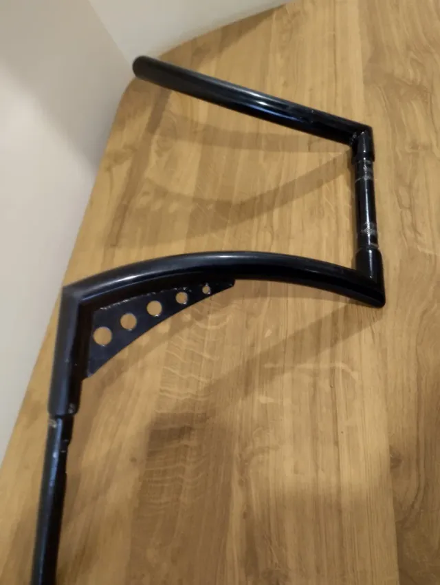 Manillar para moto estilo custom, acabado en negro brillante. - Diseño curvo y angular. - Detalle de agujeros en la base. - Fabricado en metal resistente.