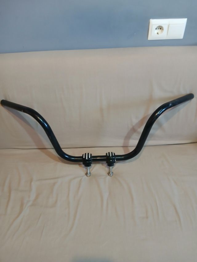 Manillar negro para moto, con un diseño curvo y elegante. - Fabricado en metal resistente. - Acabado en color negro. - Incluye soportes de montaje.