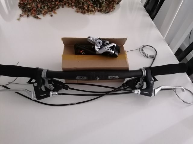 Detalles del productoSe vende manillar de bicicleta con puños y manetas de freno, junto con un cambio trasero.