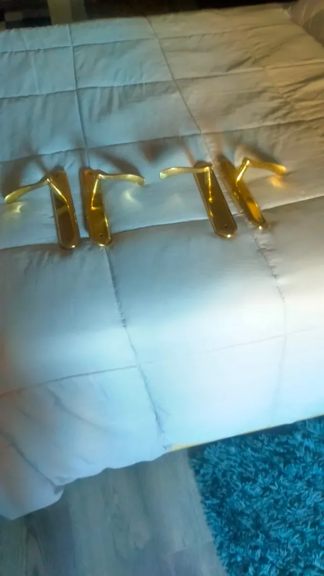 Conjunto de manillas para puertas con un acabado dorado. - Diseño elegante y moderno. - Fabricadas en metal resistente.