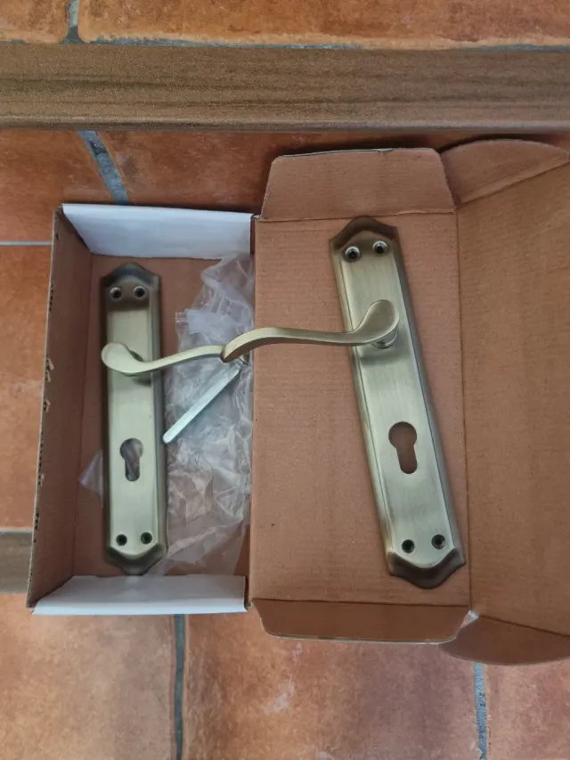 Detalles del productoJuego de manillas de puerta con un diseño clásico y acabado en bronce envejecido. Ideales para dar un toque retro a tus puertas.