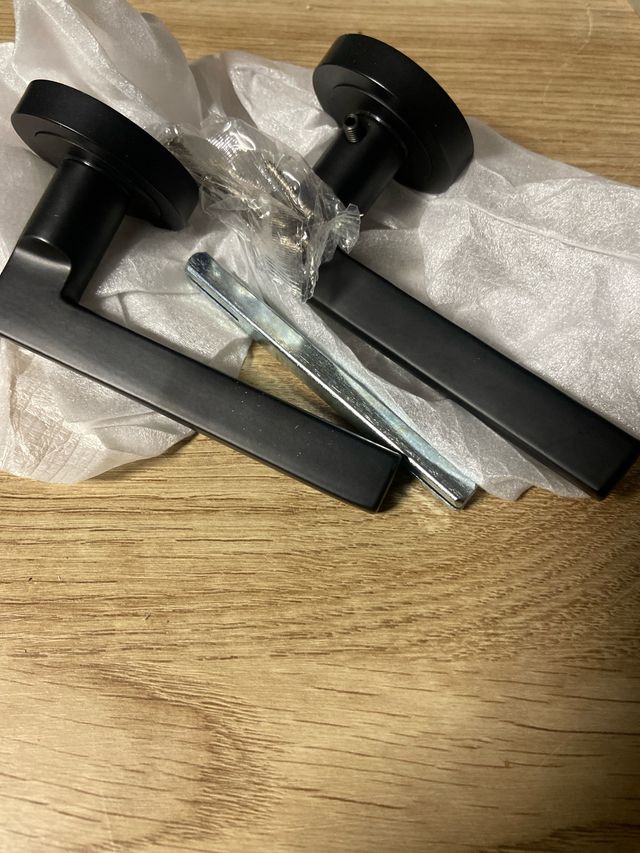 Juego de manillas para puerta en color negro. Incluye tornillería y accesorios para su instalación. - Diseño moderno y elegante. - Acabado mate.