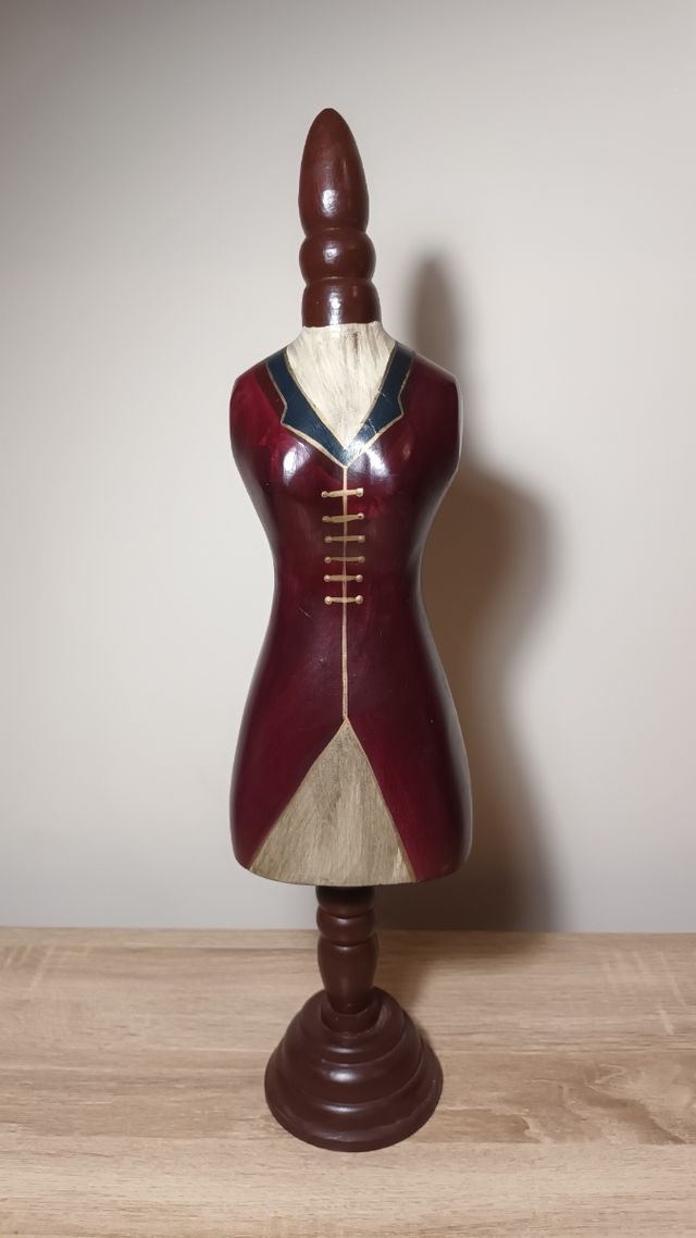 Maniquí grande de madera en tonos rojizos, marrones y dorados. Pequeña muesca en la madera en parte trasera de ofabricacion.