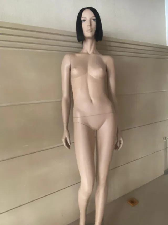 Maniquí femenino de cuerpo entero. - Color: beige. - Material: plástico. - Cabello: negro, corto.