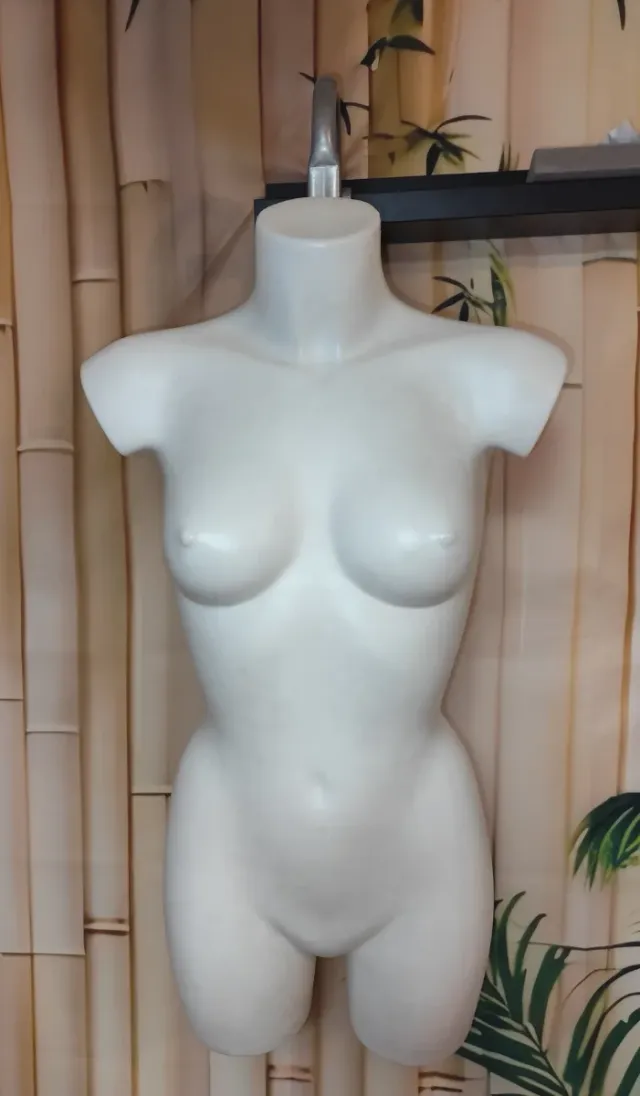 Maniquí de torso femenino en color blanco. Ideal para exhibir ropa o accesorios. - Diseño de torso completo. - Material resistente.