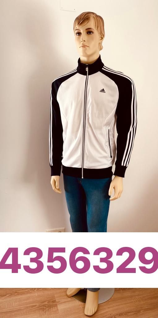 - Chaqueta deportiva blanca y negra con logo de Adidas.