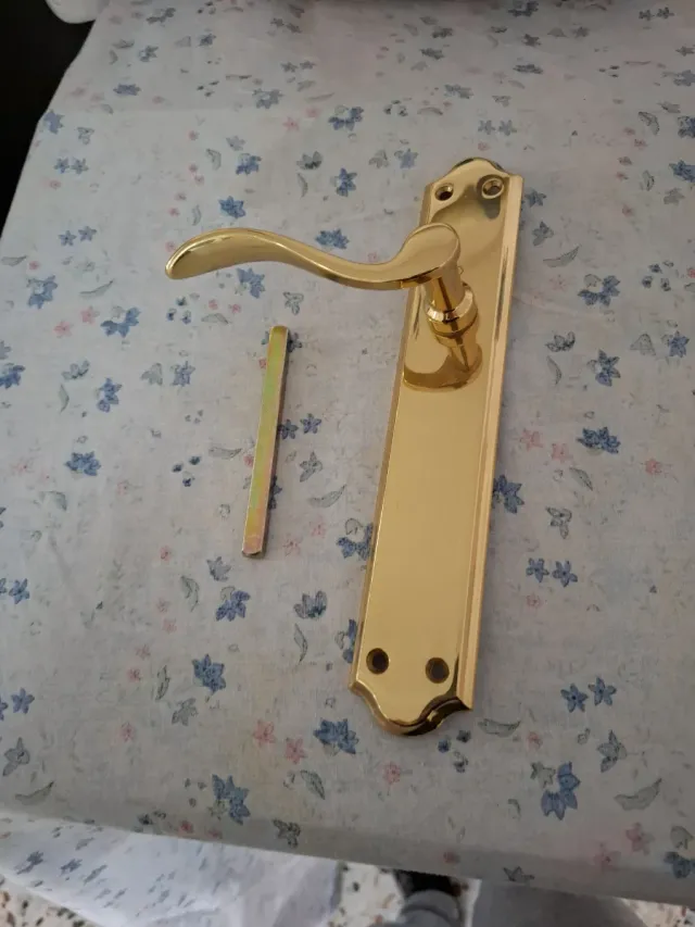 Manivela de puerta con acabado dorado brillante. Incluye la barra de conexión. - Diseño elegante. - Material metálico.