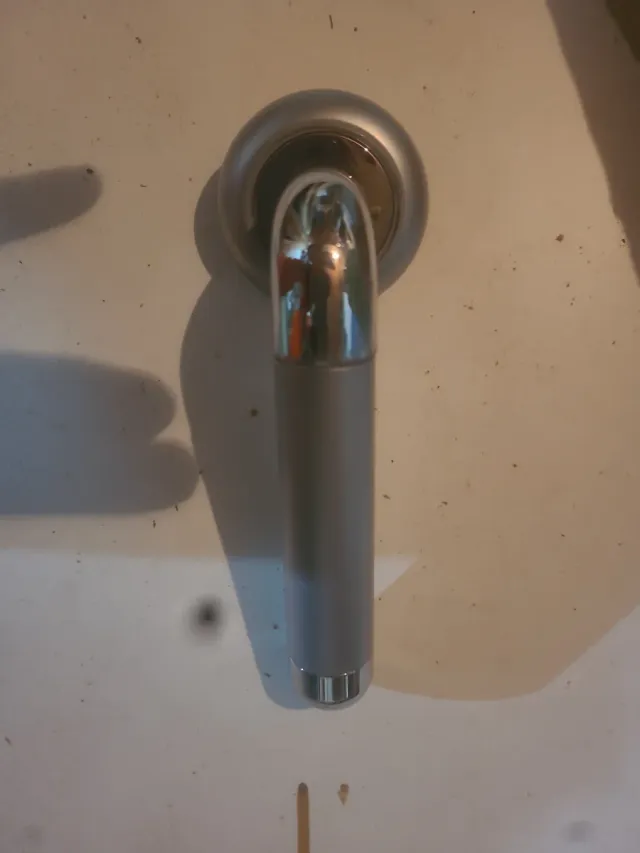 Manivela de puerta con un diseño moderno y elegante. - Acabado plateado brillante. - Mecanismo de palanca. - Base redonda.