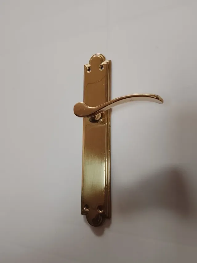 Manivela de puerta con acabado dorado. - Diseño elegante y clásico. - Placa alargada con detalles decorativos. - Material metálico brillante.