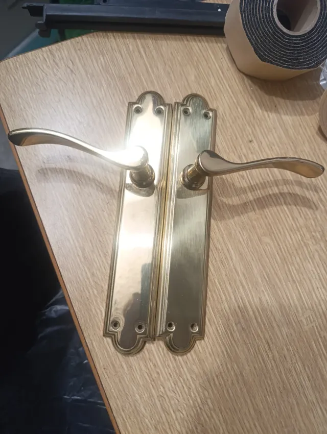 Detalles del productoJuego de 6 manivelas para puerta con acabado dorado.