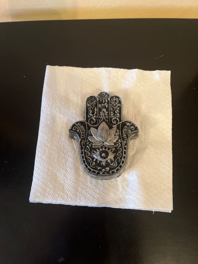 Detalles del productoMano de Fátima decorativa, elaborada en escayola y pintada a mano con un diseño detallado.