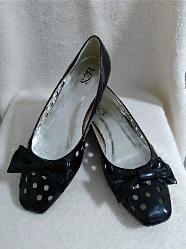 Vendo zapatos tipo manoletinas negros. Tienen agujeritos, por lo que no suda el pie y se mantiene aireado. Son bajitos. Con lacito en el centro.