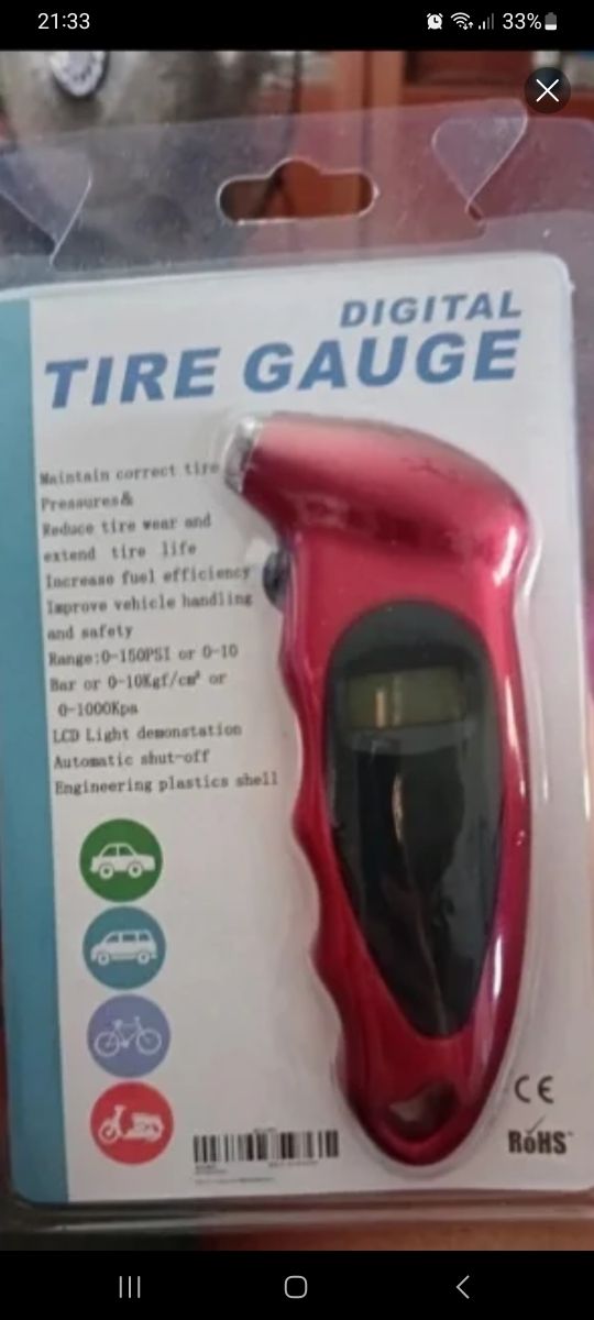 Detalles del productoManómetro digital para medir la presión de los neumáticos de tu vehículo. Su diseño ergonómico y pantalla LCD facilitan su uso.