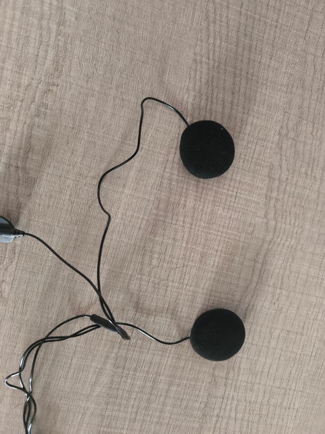 Auriculares manos libres diseñados para cascos de moto. Son discretos y se conectan fácilmente. - Dos almohadillas circulares. - Cable negro con conector.