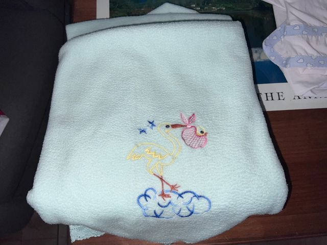Manta de cuna suave y acogedora con un bonito bordado de cigüeña. - Color: azul claro. - Diseño: cigüeña con bebé y nubes. - Material: tejido suave.